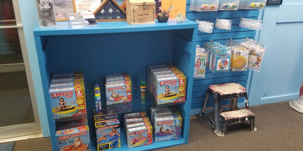 Many items to choose from, sunscreen, bug spray, inflatable tubes, beach balls, ear plugs and goggles,